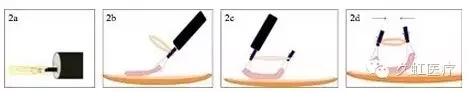 3. 另外一種更直接的方式是,把第二枚金屬夾與絲線同時固定于對側(cè)黏膜上,使剝離組織產(chǎn)生來自對側(cè)的張力,見圖 1c。但此種方法仍存不足,一是絲線本身只能提供定向拉力;二是絲線本身沒有收縮性,隨著剝離面的加大,絲線的張力會減小,其作用會隨之減弱或消失。