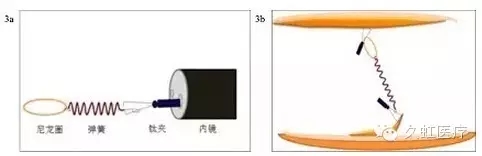 2009 年兩位日本學(xué)者 Sakamoto 和 Osada 以彈簧、金屬夾和尼龍圈為基礎(chǔ)設(shè)計出另一種體內(nèi)牽引技術(shù),并以兩人名字的首字母命名為 S-O 金屬夾牽引技術(shù)。該方法由金屬夾彈力圈聯(lián)合牽引法衍變而來,以彈簧替代彈力圈,力求獲得更大的伸縮性,來適應(yīng)大的、表淺性的結(jié)腸早期腫瘤的 ESD 切除(圖 3)。
