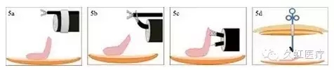 本裝置中的彈簧長度為 7 mm, 寬度為 1.8 mm,1 g 以上的力可使彈簧產(chǎn)生形變,最大伸展長度為 10 倍,最大可承拉力為 20 g。完成黏膜剝離后,用內(nèi)鏡剪剪開尼龍圈,隨標(biāo)本取出。臨床前瞻性的對照研究顯示,此方法實(shí)驗(yàn)組的手術(shù)時間、腫瘤整塊切除率和安全性均優(yōu)于對照組。